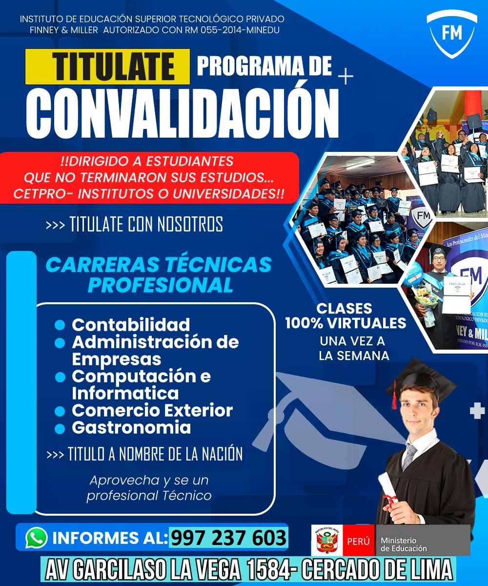 En el Instituto Finney & Miller encontrarás programas virtuales que se adaptan a tu ritmo: convalida, titúlate y estudia carreras con alta empleabilidad. Ofrecemos acompañamiento constante, clases accesibles y una ruta clara hacia tu desarrollo profesional.s